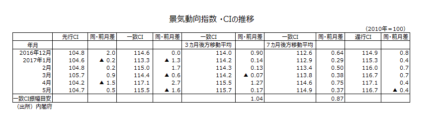 ●一致CIを使った景気の基調判断をみると、15年5月分~16年9月分の1年5カ月間もの間、景気拡張の動きが足踏み状態になっている可能性が高いことを示す「足踏みを示している」という同じ基調判断が続いていたが、16年10月分で「改善を示している」に上方修正された。その後11月分・12月分・17年1月分・2月分・3月分・4月分と同じ基調判断だった。今回5月分も「改善を示している」で8カ月連続して最高の判断が続いている。