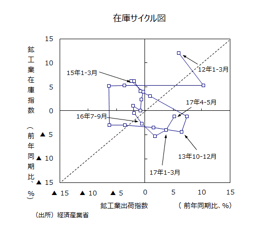 ●大きな動きをチェックするために、鉱工業全体で縦軸に在庫の前年比を、横軸に出荷の前年比をとった在庫サイクル図をみると、16年4~6月期(出荷の前年比が▲1.9%、在庫が同▲0.5%)までは45度線を上回ったままだった。16年7~9月期で出荷の前年比が▲0.5%、在庫が同▲2.7%と45度線を下回った。10~12月期では出荷の前年比が+1.8%、在庫が同▲5.3%とさらに右下に動いた。17年1~3月期では出荷の前年比が+3.7%、在庫が同▲4.0%と、1~3月期まで生産が増加しやすい「意図せざる在庫減局面」に入っていた。17年4~5月分では出荷の前年比が+5.2%、在庫が同▲1.2%と右上に動いた。現在、在庫循環図からみて、「在庫積み増し局面」に入ったと言えよう。