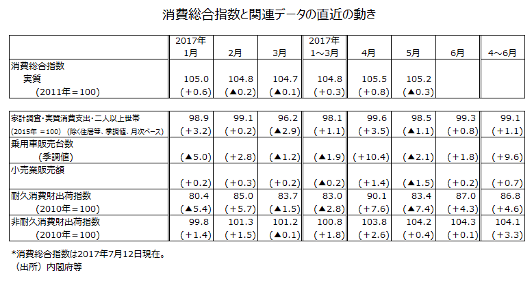 ●4~6月期の個人消費の関連データは別表のようにしっかりした前期比になった。GDP統計の実質個人消費と関連性が高い消費総合指数(月次ベース)4~5月平均の対1~3月平均比は+0.5%の増加である。総合的に考えると、4~6月期第1次速報値で6割弱のウエイトがある個人消費は、前期比でかなりしっかりした伸び率になる可能性が大きいとみられる。