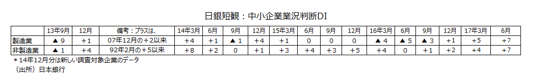 ●一方、中小企業・非製造業の業況判断DIは、13年12月調査で+4と、92年2月の+5以来21年10カ月ぶりのプラスになった。今回17年6月調査では3月調査の+4から3ポイント改善し+7となり、15期連続でマイナスになっていない。3月調査時点の「先行き」▲1を8ポイント上回った。予測よりは良かったということになる。+7は消費税引き上げ直前の駆け込み需要が出た14年3月調査+8以来の水準である。