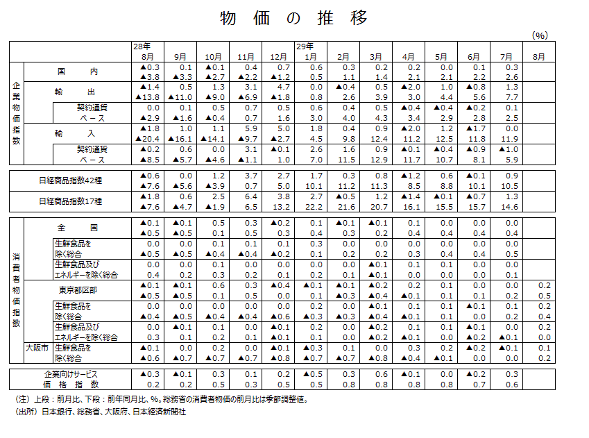 ●7月分の生鮮食品及びエネルギーを除く総合指数は100.6で、前年同月比は+0.1%になった。前月比(季節調整値)は0.0%だった。前年同月比は13年10月分以来17年2月分まで41カ月連続で上昇が続いていたが、そこで途絶えた。17年3月分では▲0.1%と13年7月分の▲0.1%以来44カ月ぶりの下落だったが、4月分・5月分・6月分はともに0.0%で、7月分で5カ月ぶりの上昇に転じた。