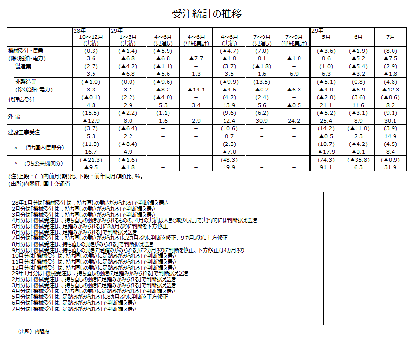 ●内閣府の基調判断は、16年9月分で「機械受注は、持ち直しの動きに足踏みがみられる」に下方修正となった。その後16年10月分~17年4月分で据え置きになったが、5月分で「機械受注は、足踏みがみられる」に8カ月ぶりに下方修正となり、6月分・7月分と同じ判断となった。