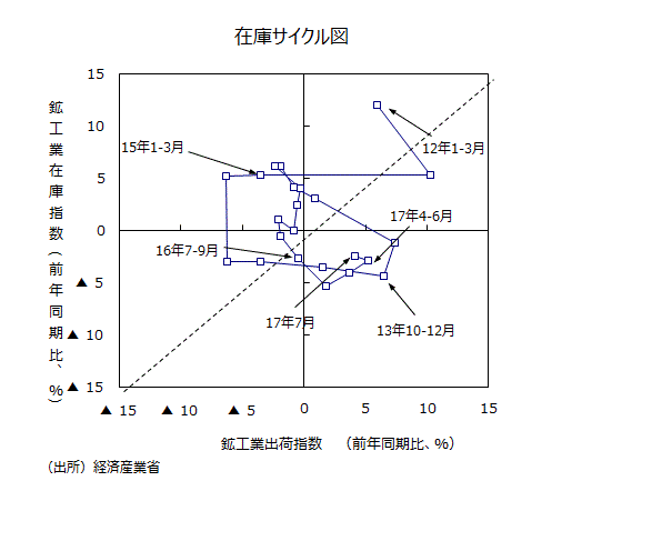 ●大きな動きをチェックするために、鉱工業全体で縦軸に在庫の前年比を、横軸に出荷の前年比をとった在庫サイクル図をみると、16年4~6月期(出荷の前年比が▲1.9%、在庫が同▲0.5%)までは45度線を上回ったままだった。16年7~9月期で出荷の前年比が▲0.5%、在庫が同▲2.7%と45度線を下回った。10~12月期では出荷の前年比が+1.8%、在庫が同▲5.3%とさらに右下に動いた。17年1~3月期では出荷の前年比が+3.7%、在庫が同▲4.0%と、1~3月期まで生産が増加しやすい「意図せざる在庫減局面」に入っていた。17年4~6月期では出荷の前年比が+5.2%、在庫が同▲2.9%になり、在庫サイクル図からみて、「在庫積み増し局面」に入った。17年7月では出荷の前年比が+4.1%、在庫が同▲2.4%になり、原点方向に近づく動きになった。