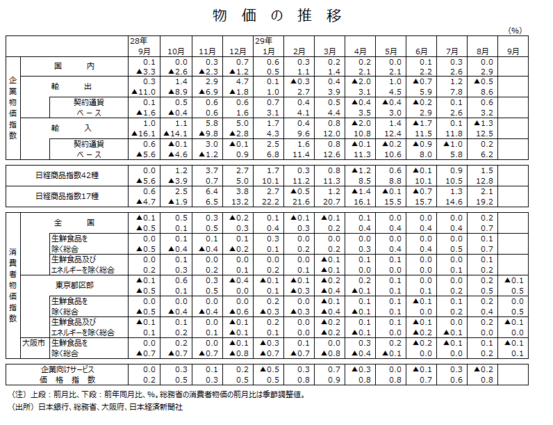 ●また、大阪市の総合9月分前年同月比は+0.3%で8月分の同+0.1%から上昇率が高まった。2カ月連続の上昇になった。生鮮食品の9月分前年同月比は+4.5%だ。