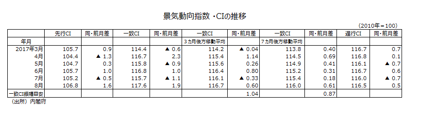 ●一致CIを使った景気の基調判断をみると、15年5月分~16年9月分の1年5カ月間もの間、景気拡張の動きが足踏み状態になっている可能性が高いことを示す「足踏みを示している」という同じ基調判断が続いていたが、16年10月分で「改善を示している」に上方修正された。その後16年11月分~17年7月分まで同じ基調判断だった。今回8月分も「改善を示している」で、11カ月連続して最高の判断が続いている。