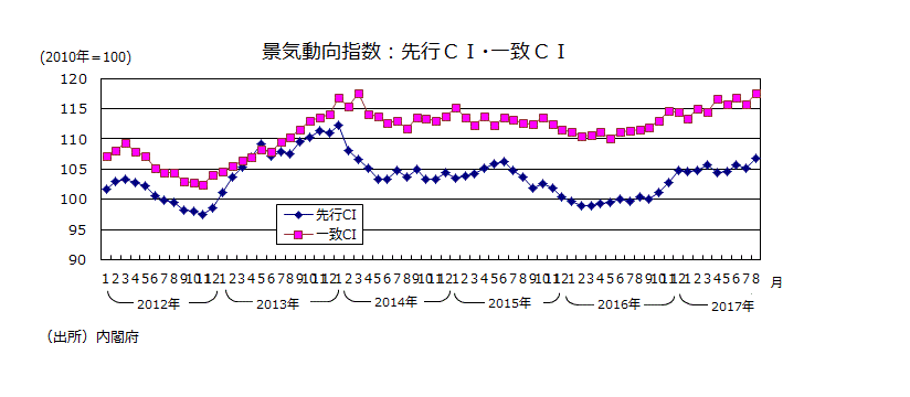 ●12年12月から始まった「アベノミクス景気」は17年3月分で52カ月間の長さになり、戦後3番目の長さであった86年12から始まった「バブル景気」の51カ月を超え、単独3位になった。景気動向指数・基調判断からみて、8月分でさらに長さの記録を伸ばし、57カ月と戦後2番目の長さであった「いざなぎ景気」と並んだ。