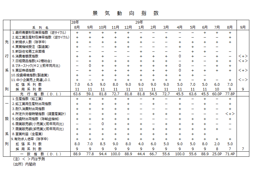 ●また、9月分の先行DIでは、数値が判明している消費者態度指数、日経商品指数、東証株価指数、中小企業売上げ見通しDIの4系列でプラス符号は消費者態度指数、日経商品指数、東証株価指数の3系列、マイナス符号は、中小企業売上げ見通しDI1系列と判明している。9月分速報値段階の先行DIは33.3%以上88.9%以下が確定している。