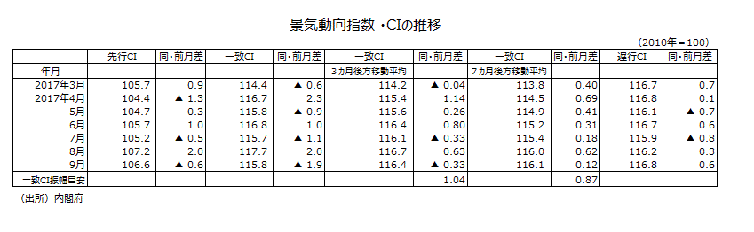 ●一致CIを使った景気の基調判断をみると、15年5月分~16年9月分の1年5カ月間もの間、景気拡張の動きが足踏み状態になっている可能性が高いことを示す「足踏みを示している」という同じ基調判断が続いていたが、16年10月分で「改善を示している」に上方修正された。その後16年11月分~17年8月分まで同じ基調判断だった。今回9月分も「改善を示している」で、12カ月連続して最高の判断が続いている。