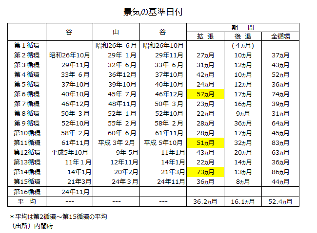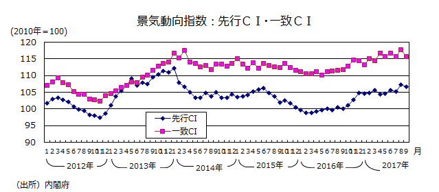 ●12年12月から始まった「アベノミクス景気」は17年3月分で52カ月間の長さになり、戦後3番目の長さであった86年12から始まった「バブル景気」の51カ月を超え、単独3位になった。景気動向指数・基調判断からみて、9月分でさらに長さの記録を伸ばし、58カ月と戦後2番目の長さであった「いざなぎ景気」を超えたことが、暫定的に確認された。公式には時間をおいて判断される。