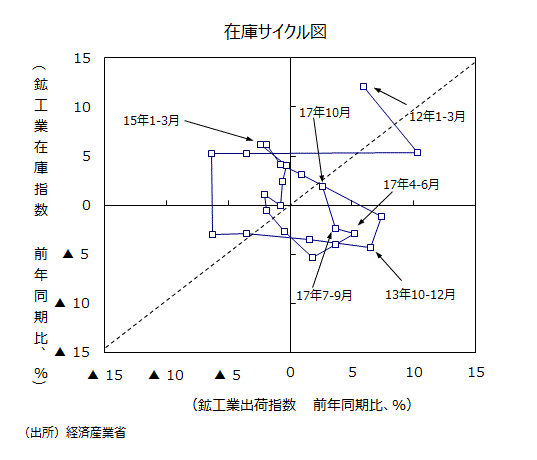 ●大きな動きをチェックするために、鉱工業全体で縦軸に在庫の前年比を、横軸に出荷の前年比をとった在庫サイクル図をみると、17年1~3月期では出荷の前年比が+3.7%、在庫が同▲4.0%と、1~3月期まで生産が増加しやすい「意図せざる在庫減局面」に入っていた。17年4~6月期では出荷の前年比が+5.2%、在庫が同▲2.9%になり、在庫サイクル図からみて、「在庫積み増し局面」に入った。17年7~9月期では出荷の前年比が+3.7%、在庫が同▲2.4%になり、引き続き「在庫積み増し局面」にある状況だ。17年10月期では出荷の前年比が+2.6%、在庫が同+1.9%となったが、船待ち在庫による一時的在庫増とみられ、10~12月期全体で局面判断する必要があろう。