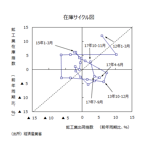 ●大きな動きをチェックするために、鉱工業全体で縦軸に在庫の前年比を、横軸に出荷の前年比をとった在庫サイクル図をみると、17年1~3月期では出荷の前年比が+3.7%、在庫が同▲4.0%と、1~3月期まで生産が増加しやすい「意図せざる在庫減局面」に入っていた。17年4~6月期では出荷の前年比が+5.2%、在庫が同▲2.9%になり、在庫サイクル図からみて、「在庫積み増し局面」に入った。17年7~9月期では出荷の前年比が+3.7%、在庫が同▲2.4%になり、引き続き「在庫積み増し局面」にある状況だ。17年10~11月では出荷の前年比が+2.5%、在庫が同+2.8%と45度線を上回ったが一時的な動きの可能性があるとみられ、10~12月期全体で局面判断する必要がありそうだ。