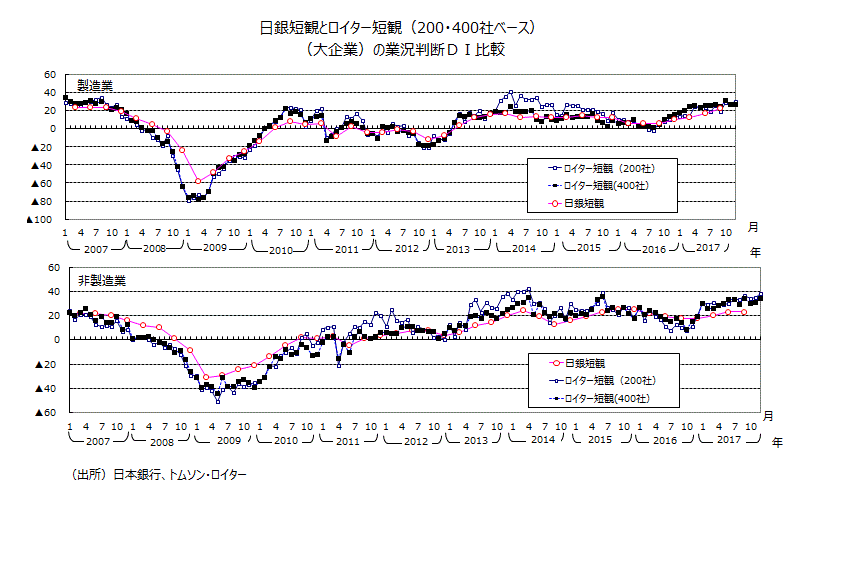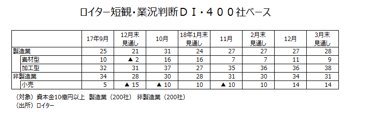 ●一方、ロイター短観12月調査の3月までの「先行き見通し」は、製造業・400社ベースで+28と12月実績の+27から1ポイント上昇見込み、非製造業・400社ベースの3月までの「先行き見通し」は+31と、12月実績の+34から3ポイントの低下予想である。