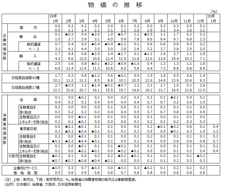 ●1月の内閣府「消費者マインドアンケート調査」で1年後の物価が上がるとみている人の割合(上昇+やや上昇)は83.8%と16年9月の調査開始以来初の80%台になった。17年4月分以降12月分までは9カ月連続して70%台になっていた。12月の日銀短観の「企業の物価見通し」は全規模・全産業でみると下げ止まり感、底打ち感が感じられる。