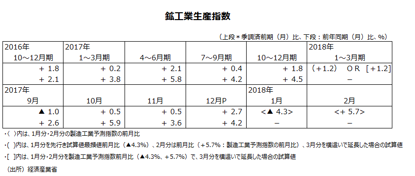 ●鉱工業生産指数・17年分の前年比は+4.5%と3年ぶりの増加になった。