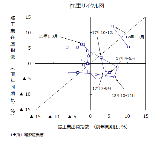 ●大きな動きをチェックするために、鉱工業全体で縦軸に在庫の前年比を、横軸に出荷の前年比をとった在庫サイクル図をみると、17年1~3月期では出荷の前年比が+3.7%、在庫が同▲4.0%と、1~3月期まで生産が増加しやすい「意図せざる在庫減局面」に入っていた。17年4~6月期では出荷の前年比が+5.2%、在庫が同▲2.9%になり、在庫サイクル図からみて、「在庫積み増し局面」に入った。17年7~9月期では出荷の前年比が+3.7%、在庫が同▲2.4%だった。17年10~12月期では出荷の前年比が+2.9%、在庫が同+2.0%なり、引き続き「在庫積み増し局面」にある状況だ。