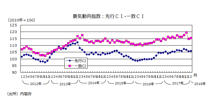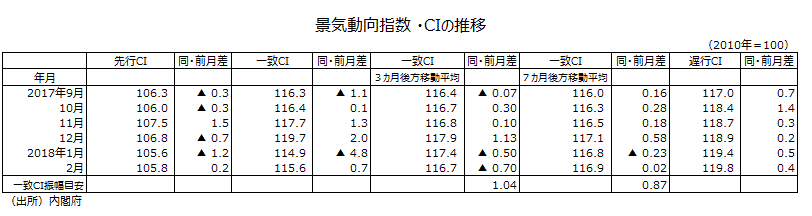 ●一致CIを使った景気の基調判断をみると、15年5月分~16年9月分の1年5カ月間もの間、景気拡張の動きが足踏み状態になっている可能性が高いことを示す「足踏みを示している」という同じ基調判断が続いていたが、16年10月分で「改善を示している」に上方修正された。その後16年11月分~18年1月分まで同じ基調判断だった。今回18年2月分も「改善を示している」で、17カ月連続して最高の判断が続いている。