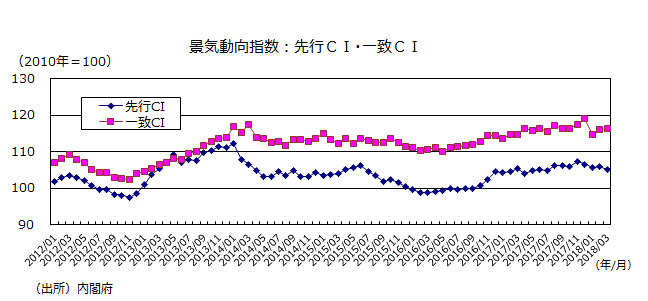 ●一致CIを使った景気の基調判断をみると、15年5月分~16年9月分の1年5カ月間もの間、景気拡張の動きが足踏み状態になっている可能性が高いことを示す「足踏みを示している」という同じ基調判断が続いていたが、16年10月分で「改善を示している」に上方修正された。その後16年11月分~18年2月分まで同じ基調判断だった。今回18年3月分も「改善を示している」で、18カ月連続して最高の判断が続いている。