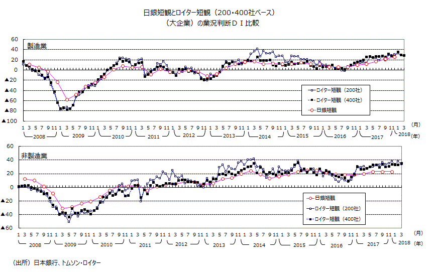 ●3月20日に発表されたロイター短観3月調査の調査期間は3月1日から3月15日である。400社ベースの製造業の業況判断DIは12月調査の+27から1ポイント上昇の+28となった。一方、200社ベースの製造業の業況判断DIは12月調査の+30から3ポイント低下の+27となった。