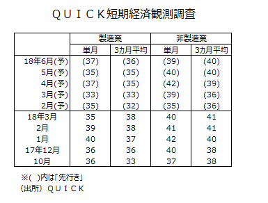 ●QUICK短観3月調査の製造業の6月までの「先行き見通し」は+37で3月実績の+35より2ポイント上昇の予想、非製造業の6月までの「先行き見通し」は+39で3月実績の+40から1ポイントの低下予想である。