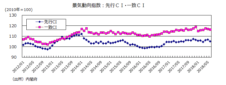 ●一致CIを使った景気の基調判断をみると、15年5月分~16年9月分の1年5カ月間の間、景気拡張の動きが足踏み状態になっている可能性が高いことを示す「足踏みを示している」という同じ基調判断が続いていたが、16年10月分で「改善を示している」に上方修正された。その後16年11月分~18年5月分まで同じ基調判断だった。今回18年6月分も「改善を示している」で、21カ月連続して最高の判断が続いている。一致CIは足元弱含み基調だが、ある程度の長さで見た景気の基調はしっかりしているとみられる。