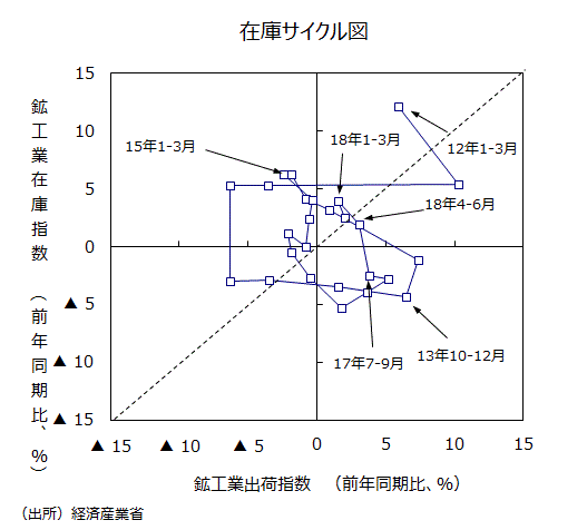 ●18年1~3月期では出荷の前年比が+1.5%、在庫が同+3.9%と「在庫積み上がり局面」に入っていたが、18年4~6月期も出荷の前年比が+2.0%、在庫が同+2.5%と、「在庫積み増し局面」に戻れずに「在庫積み上がり局面」のままになった。