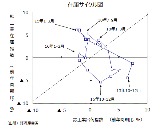 ●18年1~3月期では出荷の前年比が+1.5%、在庫が同+3.9%と「在庫積み上がり局面」に入っていたが、18年4~6月期も出荷の前年比が+2.2%、在庫が同+2.4%と、「在庫積み増し局面」には戻れずに「在庫積み上がり局面」のままになった。18年7~9月期も出荷の前年比が▲0.7%、在庫が同+5.5%と「在庫積み上がり局面」である。