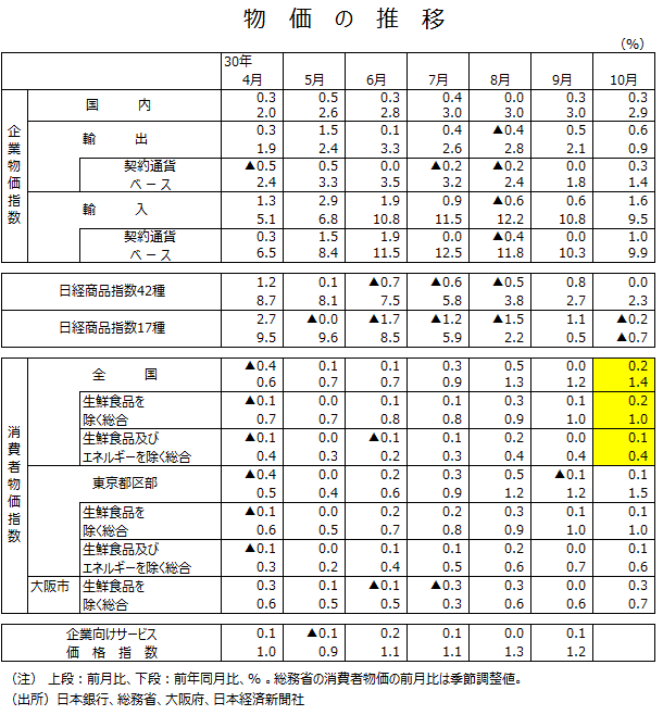 ●10月分の全国消費者物価指数・生鮮食品を除く総合指数は2015年を100とした指数で101.6、前年同月比は、9月分と同じ、+1.0%となった。前年同月比は17年1月分で13カ月ぶりの上昇に転じたあと、22カ月連続の上昇になった。9月分・10月分の+1.0%という前年同月比は、今年2月分の+1.0%以来である。