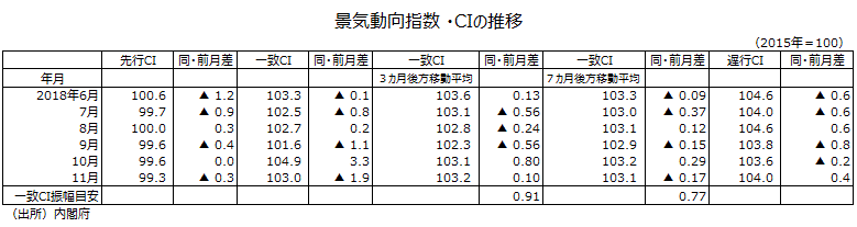 ●11月分の一致CIの指数水準は2015年=100として103.0になった。なお、直近のピークは17年12月分の105.1で、足元の水準は、2.1ポイント低い。10月分の104.9が18年では最も高い水準である。
