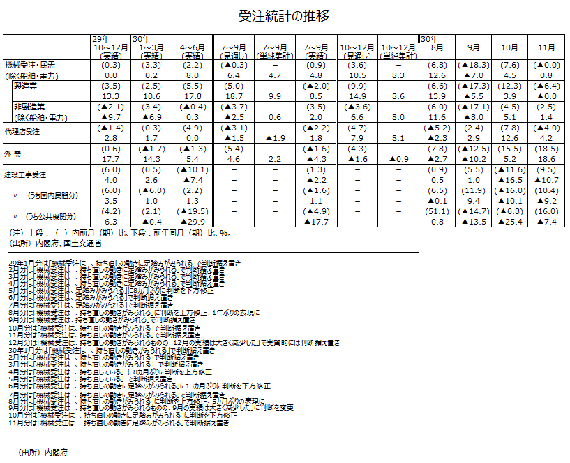 ●18年9月分では「機械受注は、持ち直しの動きがみられるものの、9月の実績は大きく減少した」と変更になった。これは17年11月分の基調判断が「機械受注は、持ち直しの動きがみられる」であったのに対し、17年12月分は、「機械受注は、持ち直しの動きがみられるものの、12月の実績は大きく減少した」と変更になったが、実質的には判断据え置きとなったことと同じであった。こうした表現は16年4月分の「機械受注は、持ち直しの動きがみられるものの、4月の実績は大きく減少した」でもみられた。