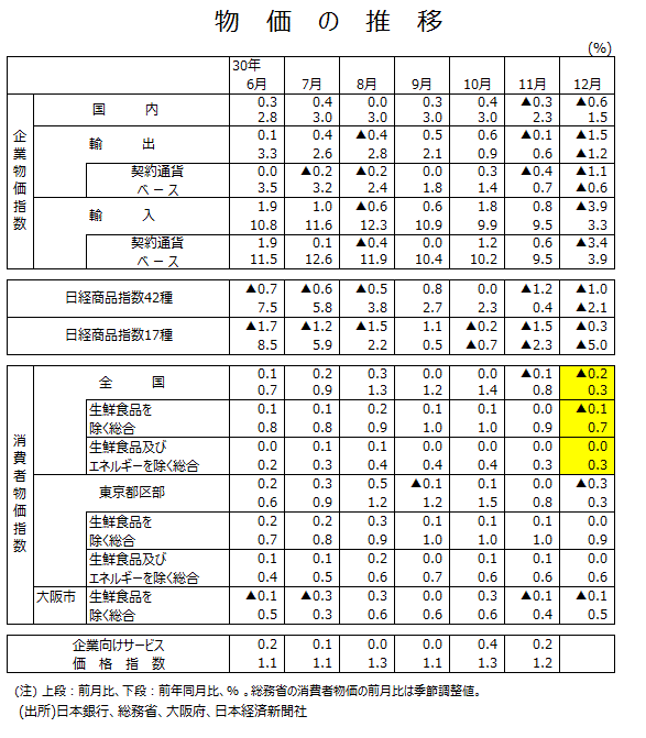 ●12月分の全国消費者物価指数・生鮮食品を除く総合指数は2015年を100とした指数で101.4、前年同月比は+0.7%で、11月分の+0.9%から0.2ポイント鈍化した。前年同月比は17年1月分で13カ月ぶりの上昇に転じたあと、24カ月連続の上昇になった。