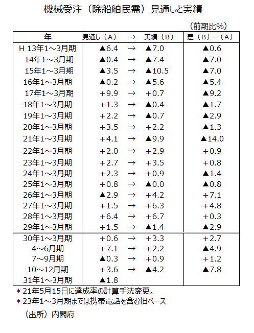 ●機械受注(除船電民需)1~3月期の前期比見通しは▲1.8%である。伸び率を達成するためには1月分~3月分の前月比が各々▲0.8%で良い。また、前期比▲0.0%のためには1月分~3月分の前月比が各々0.0で良い。前期比+0.0%のためには1月分~3月分の前月比が各々+0.1で良い。1~3月期の前期比がプラスに転じるハードルは比較的低い。達成率の計算方法が変更になった10年(平成22年)からの9年間で上振れ6回、下振れ3回となっている。実績は見通しよりも上振れしやすい。今回の見通しを計算した。達成率の3期平均は98.2%であるので、単純集計値なら1~3月期の前期比はほぼ横這いだ。1~3月期の前期比が最終的に増加になるかどうか、予断を持つことなく見守りたいところだ。