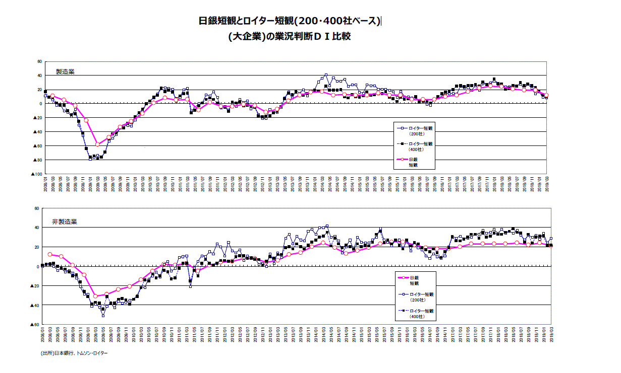 ●今回の日銀短観は、事前の予想通り、中国景気鈍化などの影響で製造業中心に景況感が大幅に悪化するという厳しい内容になった。但し、非製造業、とりわけ中小企業・非製造業の底堅さも感じられる内容だった。雇用判断は引き続きしっかりしており、19年度の設備投資計画は3月調査としてはまずまずの結果となった。次回6月調査で、今回の3月調査の先行き見通しから景況感などが上振れることが出来るかどうか、先行きの景気を占う上で注目される状況だ。
