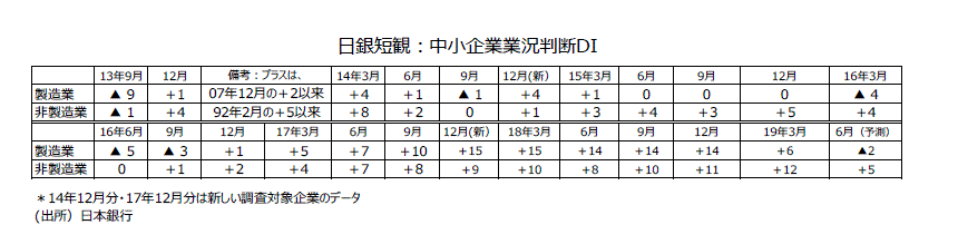 ―中小企業・製造業・業況判断DI+6で2期ぶり悪化。一方、非製造業は+12で改善―