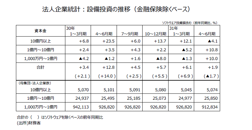 ●19年4~6月期の法人企業統計調査の全産業(金融業・保険業を除くベース)の設備投資(ソフトウェア投資額を除くベース)の前年同期比は▲1.7%と、11四半期ぶりの減少になった。19年1~3月期の前年同期比+6.9%からは8.6ポイント伸び率が鈍化した。製造業は前年同期比▲7.7%と1~3月期の前年同期比+8.4%の増加から減少に転じた。16.1ポイントも伸び率が鈍化した。非製造業は前年同期比+1.8%と1~3月期の前年同期比+6.1%の増加から減少に転じた。4.3ポイント伸び率が鈍化した。製造業が弱く、非製造業が底堅い動きである。米中貿易戦争などの影響で、輸出・生産が弱含んでいることが法人企業統計調査にも表れてきたようだ。