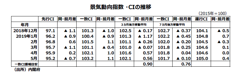 ●19年5月分では一致CIの7カ月後方移動平均は前月差マイナスだが、3カ月後方移動平均の前月差が2カ月連続のプラスになった。「当月の一致CIの前月差はプラスで、一致CIの3カ月後方移動平均の前月差のプラス幅の2か月の累積が1標準偏差分(+0.90)を上回る」ことが、「悪化」から「下げ止まり」へ上方修正される条件だ。4月分・5月分の一致CIの3カ月後方移動平均の前月差の2カ月の累計が+1.13になり、1標準偏差分(+0.90)を上回ったので、5月分の基調判断は「下げ止まり」に上方修正された。戦後最長とされる景気回復は途切れていないことを示唆するデータとなった。