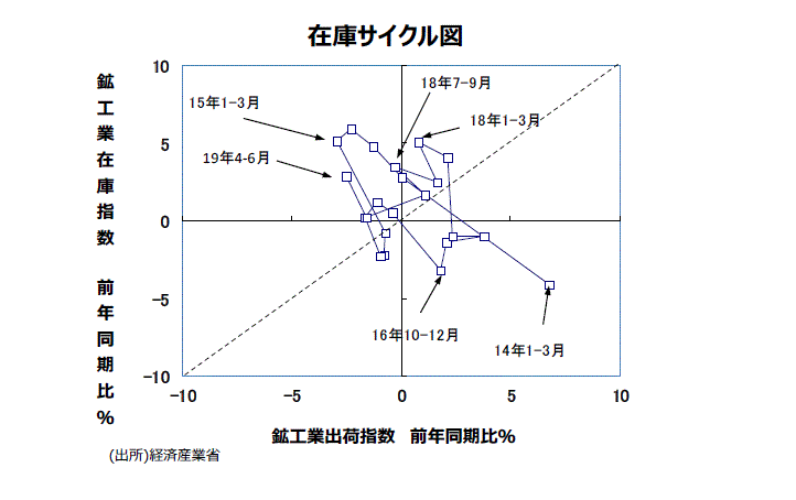 ●大きな動きをチェックするために、鉱工業全体で縦軸に在庫の前年比を、横軸に出荷の前年比をとった在庫サイクル図をつくると、17年10~12月期で「在庫積み上がり局面」に入った。18年1~3月期から7~9月期まで「在庫積み上がり局面」であった。18年10~12月期は、10~11月分までは出荷の前年同月比が在庫の前年同月比を上回り「在庫積み増し局面」に戻ることが一時的に期待されたものの、最終的には10~12月期全体では出荷の前年同期比が+1.1%、在庫が同+1.7%となり、「在庫積み上がり局面」のままであった。19年1~3月期は出荷の前年同期比が▲1.6%、在庫が同+0.2%で、続く19年4~6月期は出荷の前年同月比が▲2.5%、在庫が同+2.9%となり、依然として「在庫積み上がり局面」の状態にあることが確認された。