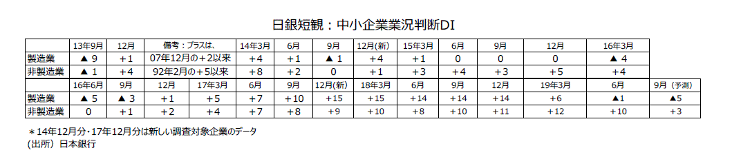 ●中小企業・製造業の業況判断DIは16年9月調査で▲3と3四半期連続マイナスになったあと16年12月調査では+1とプラスに転じ、17年12月調査で+15と9月調査より5ポイント改善した。+15は91年8月調査+20以来の水準である。18年3月調査でも+15で変わらなかったが、6月調査で+14とやや低下し、9月調査、12月調査でも+14と同水準であった。前回19年3月調査では8ポイント悪化し+6になり、今回6月調査で▲1と11期ぶりにマイナスに転じた。但し、3月調査の「先行き」見通しが▲2になるとみていたのに対し、6月調査の「最近」は▲1で、1ポイント上回った。足元の景況感が予測よりはやや良かったいう結果である。