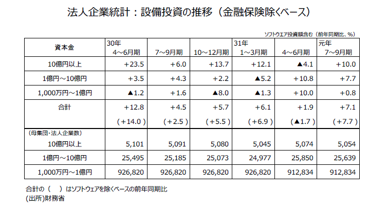 ●19年7~9月期GDP第1次速報値で、供給サイドのデータに基づいて算出した、7~9月期の名目設備投資の供給側推計値の名目原系列前期比は+7.4%で、需要側推計値(仮置き値)の名目原系列前期比は+10.3%であると公表されている。法人企業統計調査・全産業(金融業・保険業を除くベース)に設備投資(ソフトウェア投資額を除くベース)の名目原系列前期比+10.3%を当てはめると、7~9月期の前年同期比は+4.9%程度になる見込みであったが、実際に発表された法人企業統計では2.8ポイント高い7.7%になった。