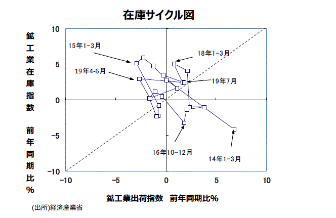 ●大きな動きをチェックするために、鉱工業全体で縦軸に在庫の前年比を、横軸に出荷の前年比をとった在庫サイクル図をつくると、17年10~12月期で「在庫積み上がり局面」に入った。18年1~3月期から7~9月期まで「在庫積み上がり局面」であった。18年10~12月期は、10~11月分までは出荷の前年同月比が在庫の前年同月比を上回り「在庫積み増し局面」に戻ることが一時的に期待されたものの、最終的には10~12月期全体では出荷の前年同期比が+1.1%、在庫が同+1.7%となり、「在庫積み上がり局面」のままであった。19年1~3月期は出荷の前年同期比が▲1.6%、在庫が同+0.2%、19年4~6月期は出荷の前年同月比が▲2.7%、在庫が同+3.0%と推移した。19年7月では出荷の前年同期比が+1.8%、在庫が同+2.4%と第1象限に移行したが、依然として「在庫積み上がり局面」の状態にあることが確認された。