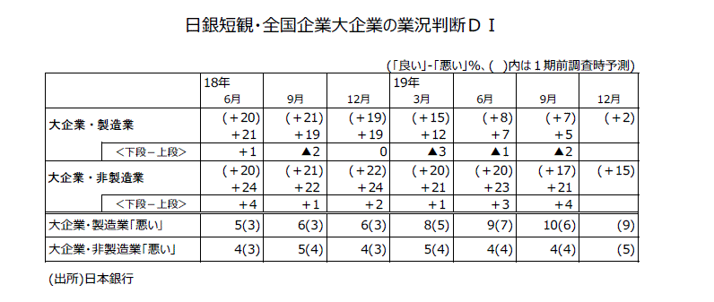 ●今回の日銀短観は、米中貿易摩擦の激化などの影響で製造業中心に景況感が引き続き大幅に悪化すると見ていた事前の予想に比べれば小幅の悪化という内容になった。また、非製造業には引き続き底堅さが感じられる内容だった。19年度の設備投資計画は6月調査に引き続き9月調査もそれなりにしっかりした結果となった。今回の9月調査の「先行き」見通しでは「最近」から景況感などが下振れる見通しだが、次回12月調査の結果が注目される状況だ。
