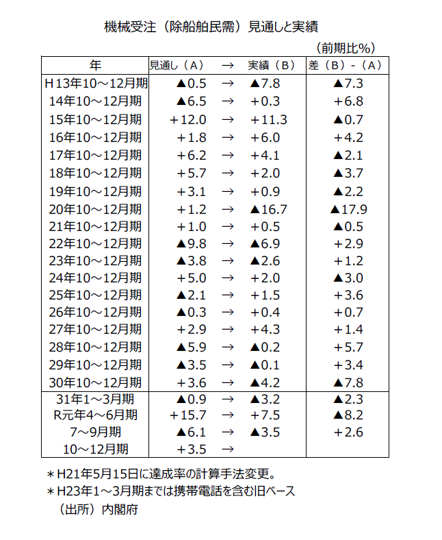 ●機械受注(除船電民需)10~12月期の前期比見通しは+3.5%である。10~12月期の前期比実績は見通しに使う達成率の計算方法を変えた09年(平成21年)からの10年間でみると、上振れ7回、下振れ3回であり、上振れしやすい傾向がある四半期である。しかし、今回は厳しそうだ。