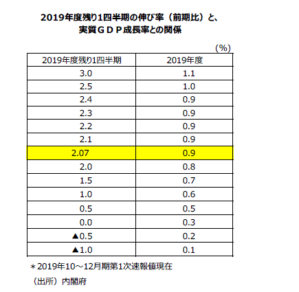 ●内閣府政府経済見通しの19年度実質GDP成長率実績見通し・前年度比+0.9%には、残り1四半期前期比年率+8.6%(前期比+2.07%)が必要である。見通し達成は厳しい状況になった。但し、18年度から19年度へのゲタは+0.6%と高い。このため仮に残り1四半期前期比▲1.0%でも19年度実質GDP成長率・前年度比は+0.1%とプラス成長になる。