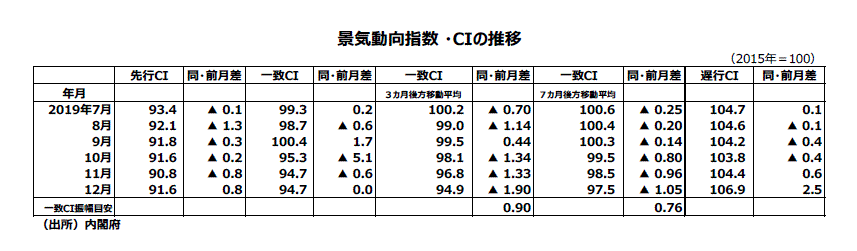 -一致CIの3カ月後方移動平均の前月差▲1.90で3カ月連続の下降-