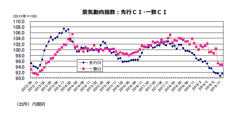 ●12月分の一致CIの指数水準は2015年=100として94.7となった。なお、直近のピークは17年12月分の105.2で、足元の水準はそれに比べると10.5ポイント低い。19年で最も高かった5月分の102.1に比べると7.4ポイント低い水準だ。19年11月分・12月分は、13年2月の93.8以来の低水準である。