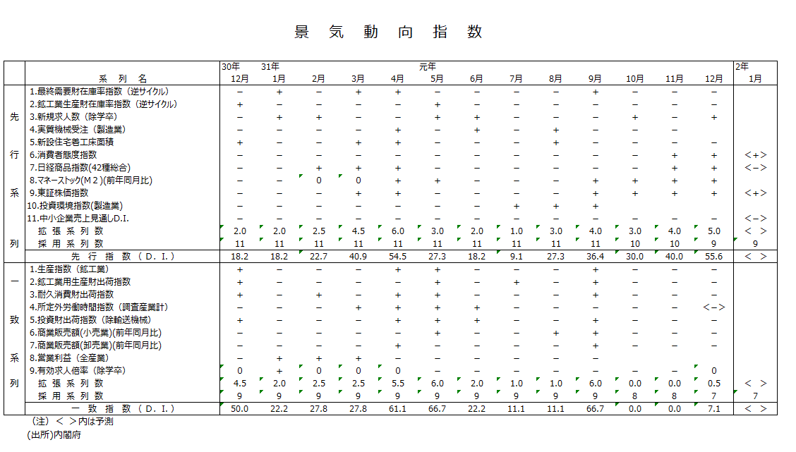 ●また、1月分の先行DIでは、数値が判明している消費者態度指数、日経商品指数、東証株価指数、中小企業売上げ見通しDIの4系列では、消費者態度指数、東証株価指数の2系列がプラス符号に、日経商品指数、中小企業売上げ見通しDIの2系列がマイナス符号になることが判明している。1月分速報値段階の先行DIは22.2%以上77.8%以下になることが確定している。
