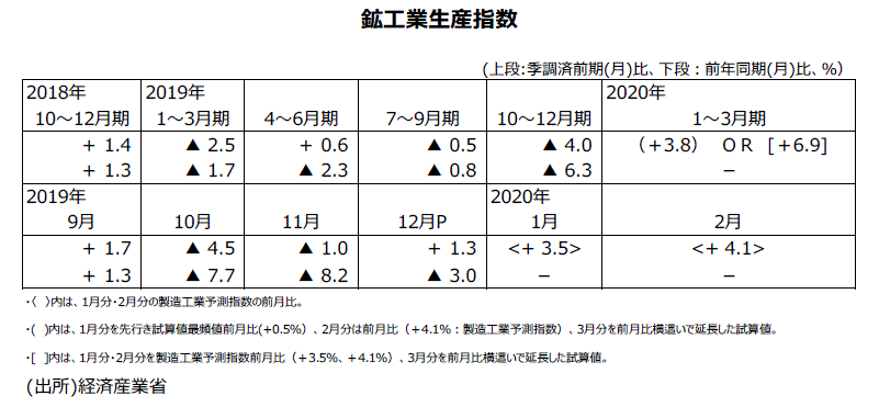 ●また、1月分は製造工業予測指数前月比(+3.5%)、2月分を前月比(+4.1%:製造工業予測指数)、3月分の前月比を横ばいで延長すると、1~3月期の前期比は+6.9%の増加になる。両者の試算値から見て、新型コロナウイルスの影響次第ではあるものの、生産の持ち直し基調が年末頃から出ていて、1~3月期の前期比は増加に転じそうな局面と言えそうだ。