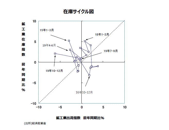 ●大きな動きをチェックするために、鉱工業全体で縦軸に在庫の前年比を、横軸に出荷の前年比をとった在庫サイクル図をつくると、17年10~12月期以降、45度線を上回って推移し、概ね「在庫積み上がり局面」が続いていた。19年4~6月期は出荷の前年同期比が▲2.7%、在庫が同+3.0%、19年7~9月期では出荷の前年同期比が▲0.1%、在庫が同+0.9%であった。19年10~12月期は出荷の前年同月比が▲6.2%、在庫が同+2.1%と、依然として45度線を上回っていて「在庫調整局面」の状態にある。