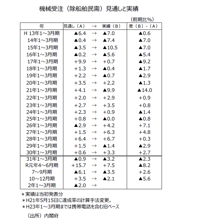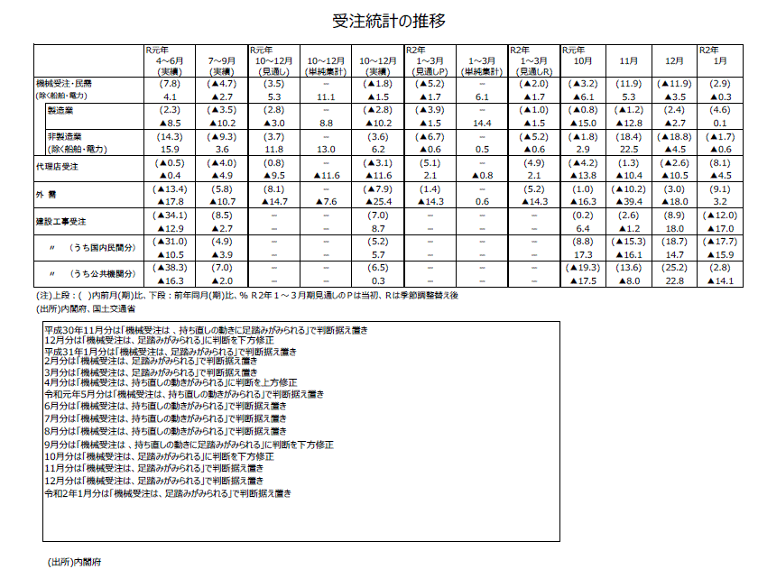 ●その後10月分では前月比が4カ月連続減少かつ3カ月移動平均が2カ月連続減少したことなどから下方修正され、18年12月分~19年3月分以来の「機械受注は、足踏みがみられる」という判断になった。11月分・12月分に続いて今回20年1月分でも、「機械受注は、足踏みがみられる」という判断は据え置きとなった。