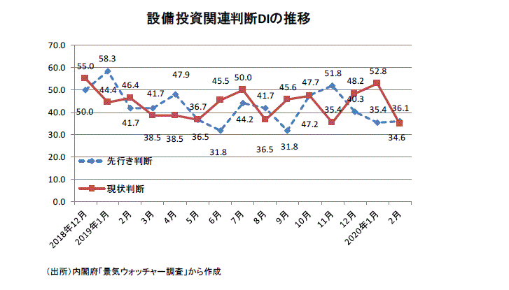 ●景気ウォッチャー調査の設備投資関連・DIの最近の動きをみてみよう。19年12月には、設備投資関連・現状判断DIが48.2(回答したウォッチャー14人)と19年7月50.0以来の水準に戻った。20年1月の現状判断DIが52.8(同9人)と18年12月分の55.0以来の50超となった。グラフからは設備投資関連・現状判断DIの底堅さが感じ取れるようになってきていた。しかし、新型コロナウイルスの影響で20年2月の現状判断DIは34.6(同13人)へと急落した。