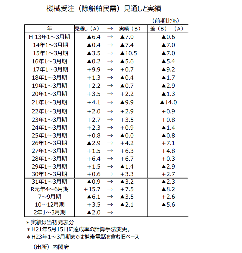 ●その後10月分では前月比が4カ月連続減少かつ3カ月移動平均が2カ月連続減少したことなどから下方修正され、18年12月分~19年3月分以来の「機械受注は、足踏みがみられる」という判断になった。11月分・12月分・20年1月分に続いて、今回2月分でも、「機械受注は、足踏みがみられる」という判断は据え置きとなった。